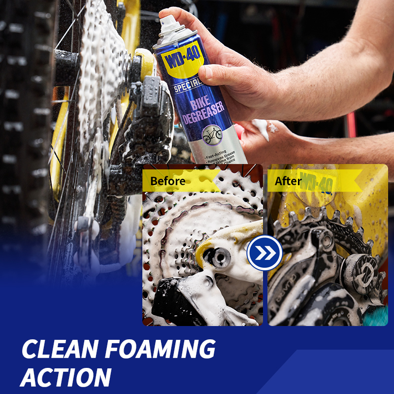 WD-40 Specialist® Bike Degreaser foaming action clings to chain, cogs and gears to deeply penetrate and remove stubborn grease and grime from all moving parts. Experience the difference of a fast-acting professional grade formula that removes dirt, mud & grime.