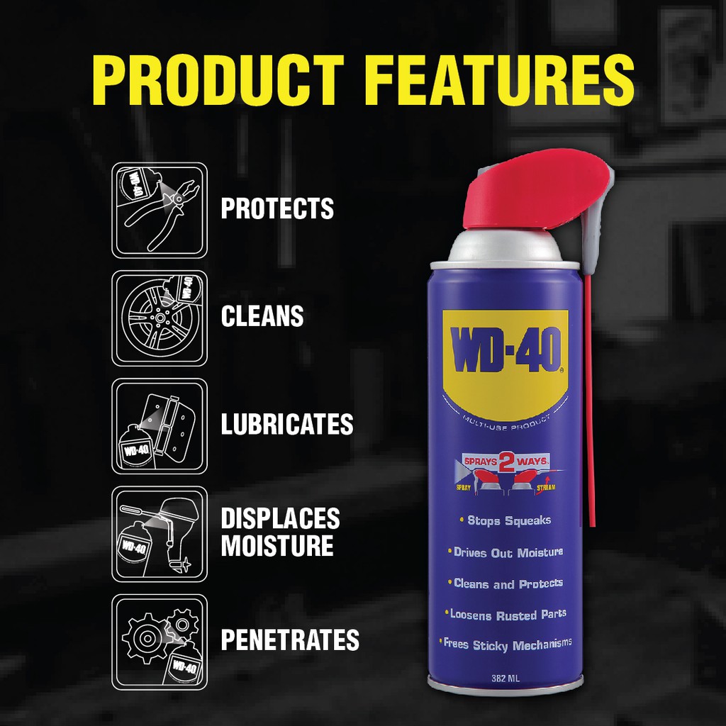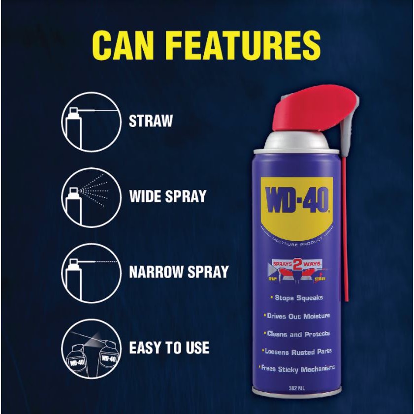 382ml SMART STRAW - NEVER LOSE THE STRAW AGAIN WITH WD-40 SMART STRAW. It features a permanently attached straw that sprays two ways. Simply flip it up for a precision stream and down for a regular spray action.